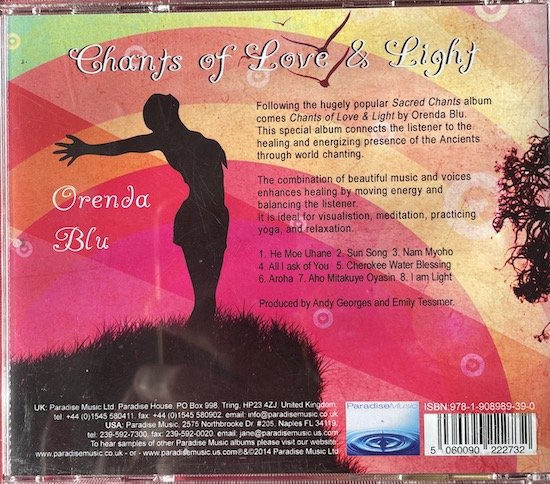 Chants of Love and Light by Orenda Blu. This special album connects the listener to the healing and energizing presence of the Ancients through world chanting. The combination of beautiful music and voices enhances healing by moving energy balancing the listener. It is ideal for visualisation, meditation, practicing yoga, and relaxation.